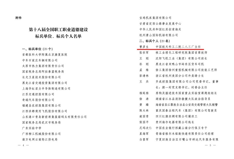 近日,中國航天科工二院283廠職工曹彥生獲得第十八屆全國職工職業(yè)道德建設(shè)標(biāo)兵個人稱號。